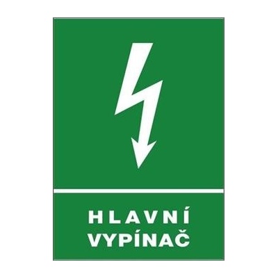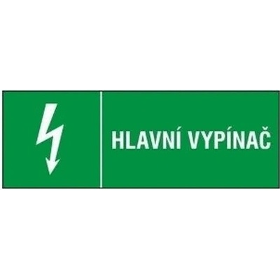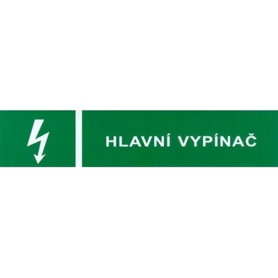 Bezpečnostní výstraha Hlavní vypínač s bleskem je bezpečnostní samolepka bílého textu Hlavní vypínač na zeleném podkladě velikosti samolepky 130 x 35 mm.
