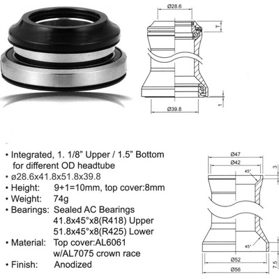 Integrované hlavové složení tapered (1 1/8" -1,5") - kuličková ložiska s těsněním. Materiál Al6061/Al7075 (hliník). Integrované hlavové složení tapered - kuličková ložiska s...