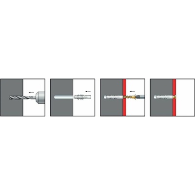 Způsob montáže 1. Vyvrtáme otvor vhodného průměru a hloubky. 2. Vložíme plášť hmoždinky do otvoru přes upevňovaný díl a zatlučeme kladívkem do vhodné hloubky. 3. Dotáhneme vrut...