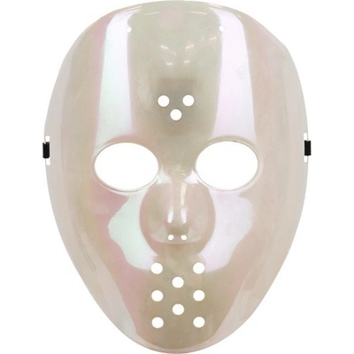 Halloweenská maska v designu připomínající hokejovou masku, v perleťově bílé barvě. Velikost je univerzální a uchytíte jí pomocí gumičky. Materiál: plast Rozměr: 20 x 24 cm