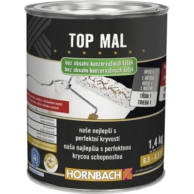 Top Mal HORNBACH bez konzervačních látek je hluboce matná, vodou ředitelná disperzní barva nejvyšší kvality na nátěry stěn a stropů v interiéru, která kryje v prvním nátěru....