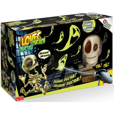 Zábavná společenská hra, ve které dva soutěžící loví ducha, co se drze zjevuje na stěně. Figurka kostlivce vysoká 18 cm promítá na stěnu nebo strop obrysy duchů – úkol je jasný: trefit je pistolí. Skóre si s přehledem počítá sám kostlivec. Obsah balení: kostlivec, 2...