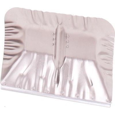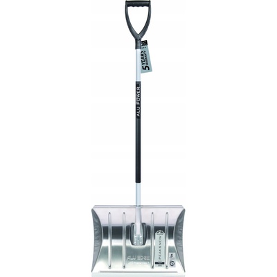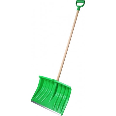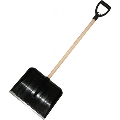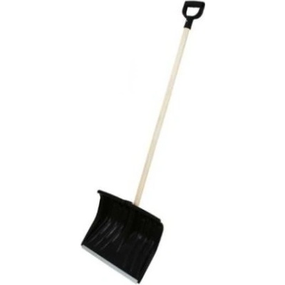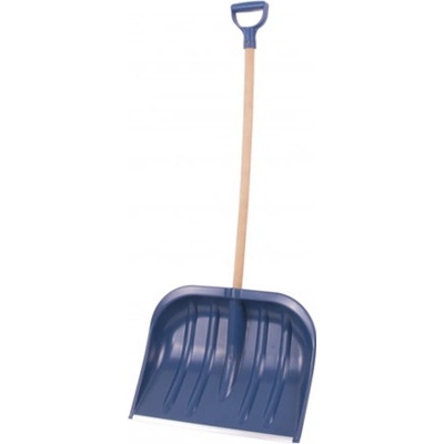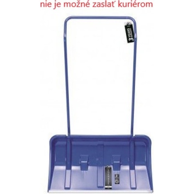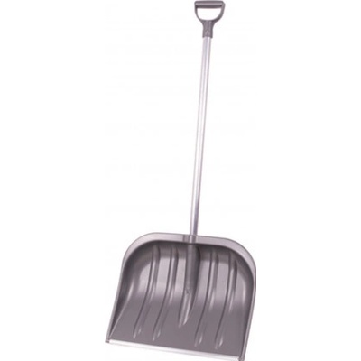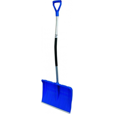 Plastová lopata na sníh s tvarovanou hliníkovou násadou ukončenou plastovým úchytem. Šíře záběru je opatřena kovovou lištou.