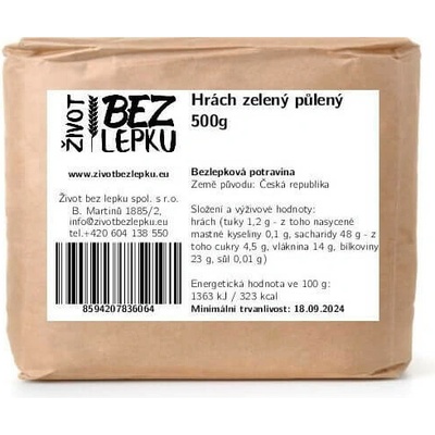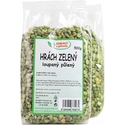 Administrativní zařazení: Luštěnina Složení: Hrách zelený loupaný půlený 100% Země původu: Česko, Slovensko Skladování: Skladujte na temném, chladném a suchém místě. Výživové...