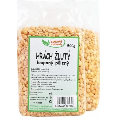 Zákonná odmítnutí odpovědnosti Země původu – dle aktuální nabídky Hrách žlutý loupaný půlený. Složení Výrobek může obsahovat stopy sóji a lepku.