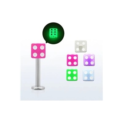 Labreta se svíticí hrací kostkou PLA00218. Piercing je vyrobený z chirurgické oceli 316l, hrací kostka z akrylátu.