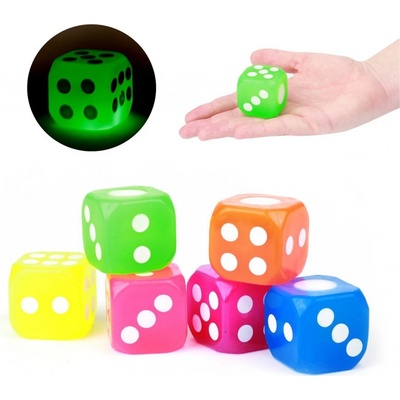 Klasická hrací kostka se světelnými efekty. Velikost 4 cm. Zabudované baterie nelze měnit. Barevní varianta je dodávána náhodile dle aktuální skladové dostupnosti.