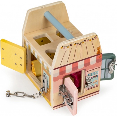 Dřevěná malovaná motorická kostka s interaktivními prvky. Batolata zde objeví zvířátkový labyrint, hlavolam, xylofón, zvířátkovou knížku, zábavná ozubená kolečka a kolečkovou...