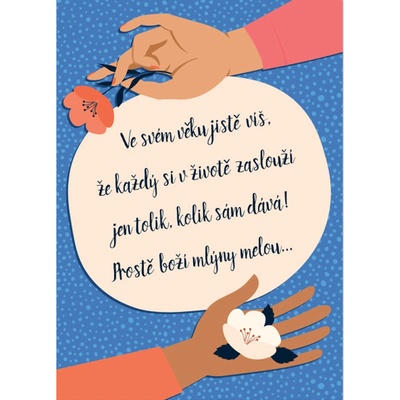 Moderní hrací přání k narozeninám. Po otevření přáníčka začne hrát píseň Boží mlejny melou od Ewy Farne. Moderní hrací přání k narozeninám. Na přední straně je text: "Ve svém...