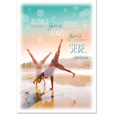 Originální přání k svatbě s písní Jakobynic, kterou zpívá Helena Vondráčková a Jiří Korn Text na úvodní straně: Hledali jsme štěstí a našli jsme sebe. Text uvnitř přání: Krásný...