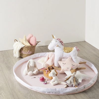 Tato okouzlující barevná podložka s motivem jednorožce v sobě spojuje tři funkce: klasickou hrací podložku s oblouky a ramínky, suchý bazének s míčky a měkký prostor pro...