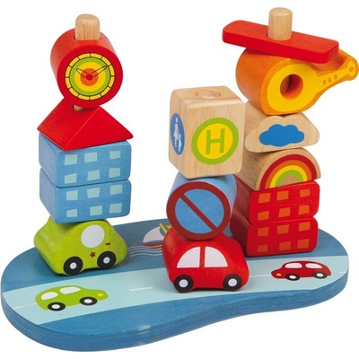Naskládání prvků tohoto kvalitně zpracovaného a barevně lakovaného dřevěného města vyžaduje šikovnost malých rukou! Děti zde také poznají některé důležité dopravní značky....