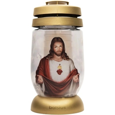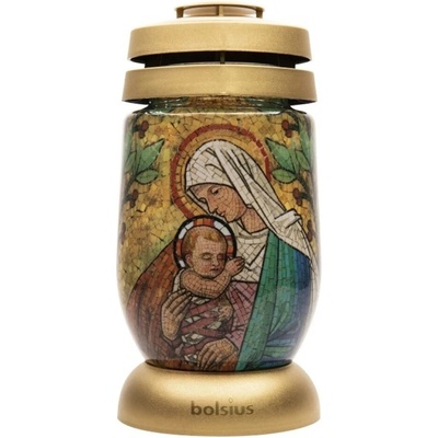 Skleněná lucerna s náboženským motivem Panny Marie a 24hodinovým vkladem.