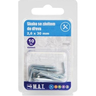 rozměry (D x pr.): 30 x 2,6 mm materiál: Zn 10 ks Skoba se závitem do dřeva 30 x 2,6 mm slouží pro snadné zašroubování do dřeva a následné zavěšení předmětů a břemen.