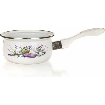 Smaltovaný rendlík LAVENDER 0,65 l, rozměry: průměr 14 cm, výška 7 cm, bílá glazura, dekor levandule na vnější straně, bakelitová rukojeť. Rendlík lze používat na všechny typy varných desek.