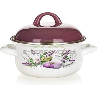 Rendlík LAVENDER 20 cm, s poklicí. objem: 2,1 l průměr: 20 cm výška (bez poklice): 9,7 cm materiál: smalt tloušťka stěny): 0,6 mm barva: rendlík - bílá s dekorem levandule,...