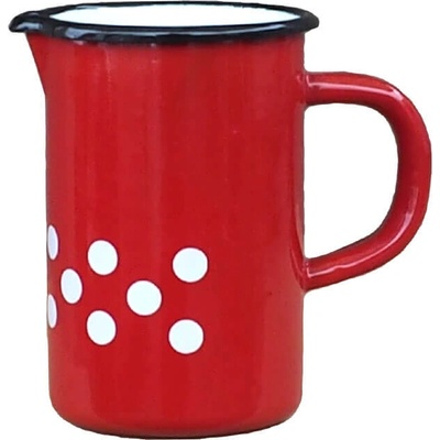 Smaltovaný hrnek s ouškem - vysoký. Objem 0,5 L. Průměr hrnku: 7,7 cm. Výška hrnku: 12,7 cm. Materiál: kov, smalt. Barva: červená, bílá.