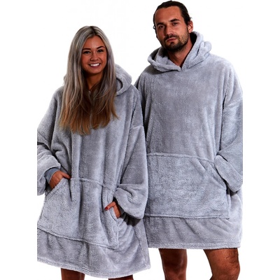 Deka k telce – huňatá mikina s rukávy, kapucí a praktickou kapsou v šedé barvě o délce 165 cm spojuje pohodlí měkké deky s funkčností mikiny pro domácí relax.