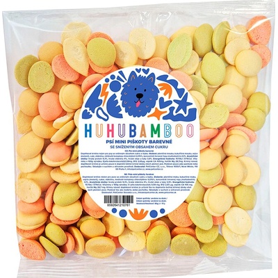 Huhubamboo MINI piškoty pro psy MIX 80 g Psí MINI piškoty se sníženým obsahem cukru. Doplňkové krmivo pro psy. Vhodné jako odměna při výcviku. Složení: pšeničná mouka,...