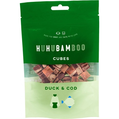 Huhubamboo kostky s kachním a treskou 75g Masové pamlsky. Doplňkové krmivo pro dospělé psy a kočky všech velikostí a plemen. Bez barviv a přidaného cukru Posiluje žvýkací...