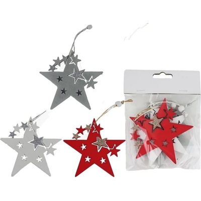 Sada dekoračních hvězd k zavěšení. Sada obsahuje 3 hvězdy. Rozměry: 10 x 0,5 x 10 cm. Materiál: dřevo. Barva: šedá, bílá, červená. Tento výrobek není hračka. Plastový obal...