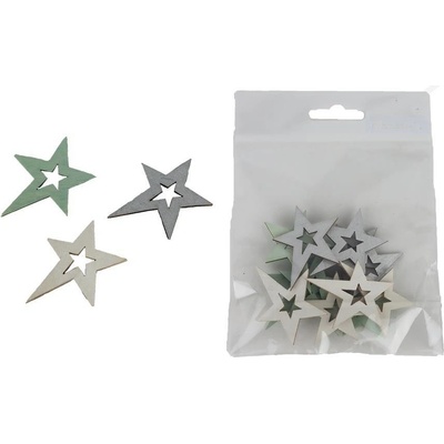 Sada dekoračních hvězdiček. Sada obsahuje 12 hvězdiček. Rozměry: 3,3 x 0,2 x 4,1 cm. Materiál: dřevo. Barva: šedá, bílá, zelená. Tento výrobek není hračka. Plastový obal...