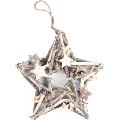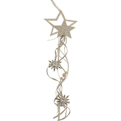 Dekorační hvězda k zavěšení. Dekorace má rozměry 12 x 11,5 cm, tloušťka 0,3 cm, celková délka dekorace 60 cm. Rozměry: 12 x 0,3 x 60 / 11,5 cm. Materiál: dřevo, kov. Barva:...
