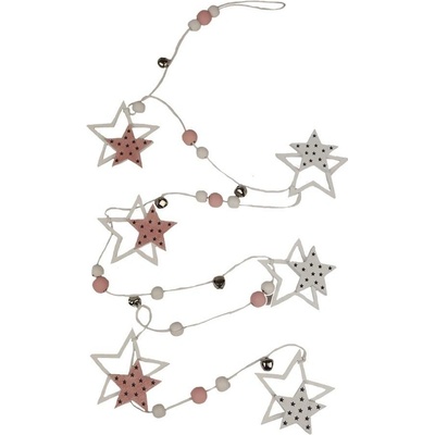 Dekorační girlanda - hvězda. Rozměry: 5,7 x 0,5 cm, výška 6 cm, celková délka girlandy 120 cm. Barva: kombinace bílá s růžovou. Materiál na bázi dřeva.