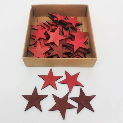 Hvězdy z březové kůry bordó / červená barva o průměru 4 centimetrů, baleno v krabičce po 48 kusech.