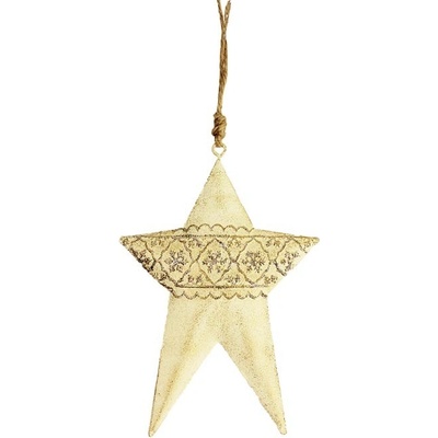 Velice hezká hvězda k zavěšení. Rozměry : 11,5 x 1,5 cm, výška 16,5 cm. Barva : champagne. Materiál : kov. Rozměry: 11,5 x 1,5 x 16,5 cm. Materiál: kov. Barva: krémová....