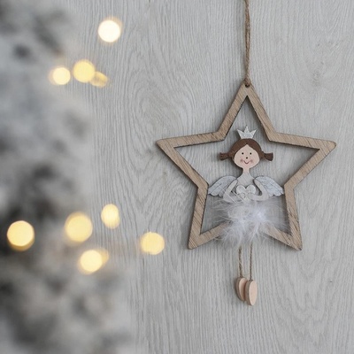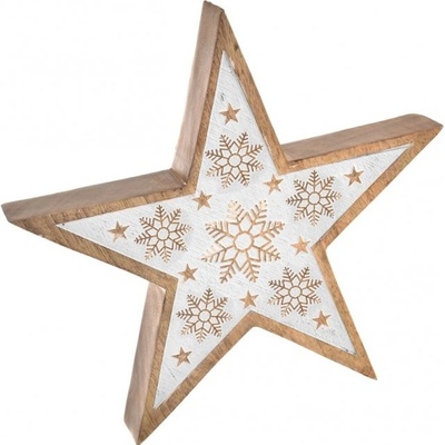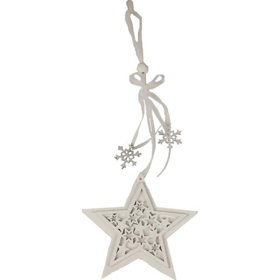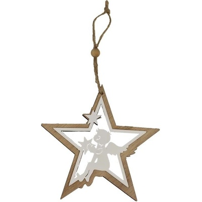 Dekorační hvězda k zavěšení. Rozměry: 12 x 1 x 11 cm. Materiál: dřevo. Barva: hnědá, bílá. Tento výrobek není hračka.