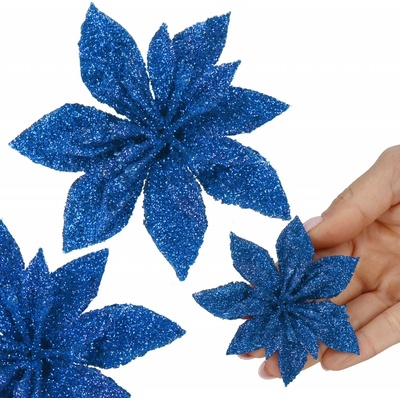 Umělý květ modré vánoční růže se třpytivými okvětními lístky. Realistické zpracování, spodní trn pro snadné uchycení, např. pomocí vázacího provázku, do různých vánočních...