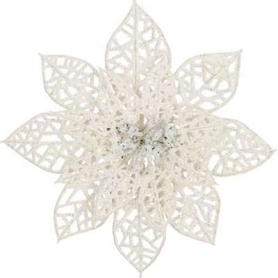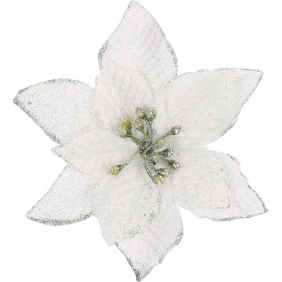 Umělý květ růže s klipem dokonale doplní vánoční výzdobu. Detailně prolamovaný vzor, elegantní třpytky, spodní klip pro snadné uchycení. Velikost 11x11 cm, bílá barva. Umělý...