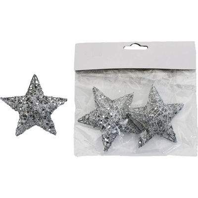 Sada dekoračních hvězdiček. Sada obsahuje 3 hvězdičky. Rozměry: 7,5 x 7,5 x 3 cm. Materiál: přírodní. Barva: stříbrná. Tento výrobek není hračka. Plastový obal odstraňte z...