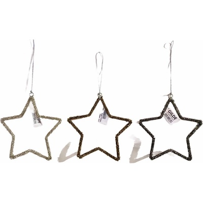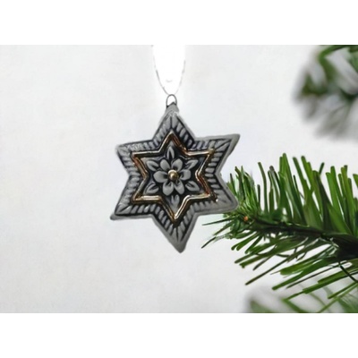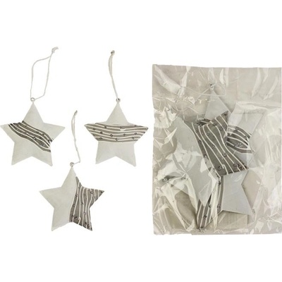 Dekorační hvězda k zavěšení. Rozměry: 8 x 8 x 1 cm. Materiál: kov. Barva: bílá, šedá. Tento výrobek není hračka. Plastový obal odstraňte z dosahu dětí. Hrozí udušení.