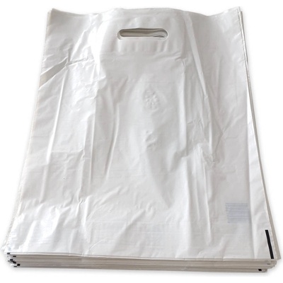 Taška igelitová s uchem LDPE BÍLÁ. Igelitová taška s páskovým uchem bílé barvy, síla fólie je 40 mikronů, materiál LDPE, cena za kus.