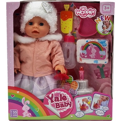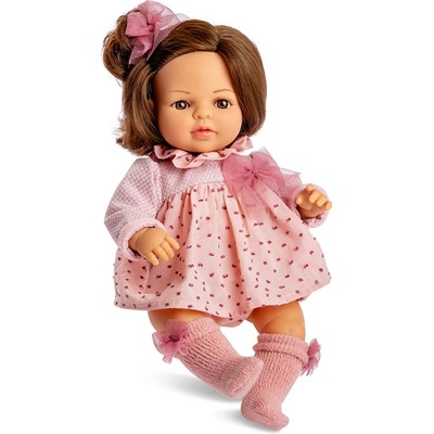 Realistická panenka–miminko s měkkým tělíčkem a vinylovou hlavičkou, ručičkami a nožičkami. Vydává 10 zvuků (smích, „mama“, „tata“…). V balení dudlík, chrastítko a lahvička. Baterie CR2032 jsou součástí.