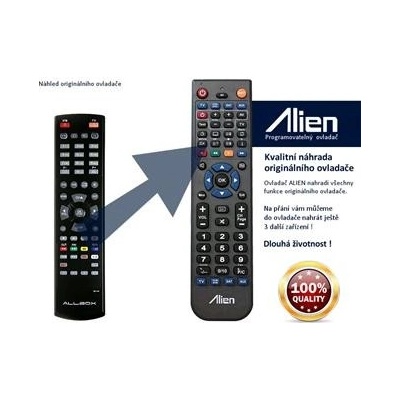 Dálkový ovladač Allbox HD 3500 IR Kvalitní náhradní dálkové ovládání jiného vzhledu pro Satelitní příjímač Allbox HD 3500 IR. Pod značkou ALIEN získáte kvalitní a levnou...