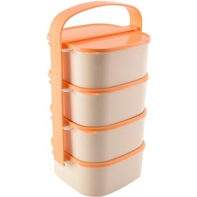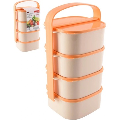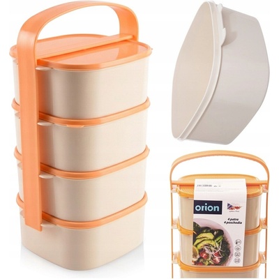 Orion Jídlonosič AlmiOranžovo-béžový třípatrový jídlonosič ALMI o objemu 4 × 1,15 l. Obsahuje 4 hranaté misky z kvalitního plastu, z nichž je každá opatřena vlastním víčkem....