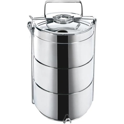 Podrobnosti o produktu OR120958 Nerezový třípatrový termojídlonosič v rovném provedení, jehož součástí jsou 3 dvoustěnné misky o průměru 16 cm, vrchní poklice a kovový stojan s...