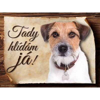 Cedulka Jack Russel Terier hliníková s nápisem "Tady hlídám já!" Kovová výstražná venkovní cedulka oznamující to či ono, že se ve vašem obydlí může návštěvník setkat s vašim...