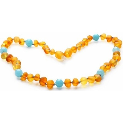 Okouzlující a atraktivní jantarové korálky pro děti na zoubky ze satinovaných kousků jantaru barvy koňaku v kombinaci s kulatými korálky apatitu, avanturínu a lapisu...