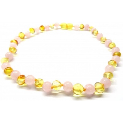 Okouzlující přírodní jantarové korálky pro děti na zoubky z oblých kousků satinovaného jantaru nádherné medové barvy s korálky přírodního růženínu. Kousky jantaru jsou typu...