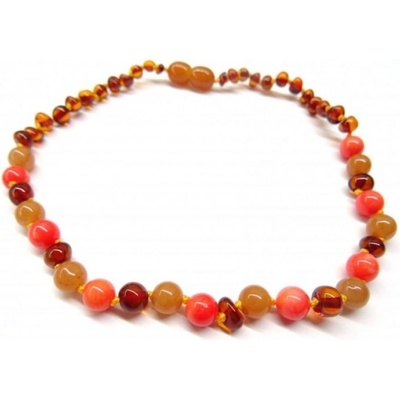 Okouzlující a velice atraktivní jantarové korálky pro děti na zoubky ze satinovaných větších kulatých kousků medového jantaru v kombinaci s kulatými korálky růženínu, červeného...