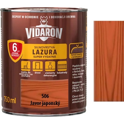 Vidaron silnovrstvá lazura super vydatná S06 Javor japonský Super účinná dekorativní a ochranná lazura na dřevo se díky své gelové konzistenci vyznačuje omezeným stékáním i z vertikálních povrchů a zajišťuje snadnou a pohodlnou aplikaci. Vytváří na povrchu odolný a...