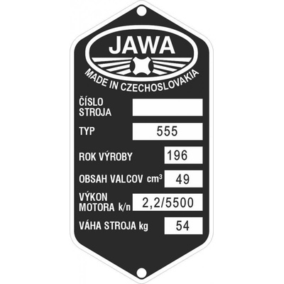 Štítek výrobní Jawa 555 - pionýrProvedení elox. hliník. Doživotní záruka na černou barvu.Další služba: Na výrobní možný tisk nebo ražba (raznice 4mm) Vašich údajů. Tisk nebo...