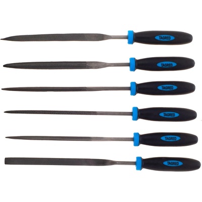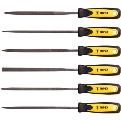 Kovové jehlové pilníky, sada 6 kusů, L 150, O 3 mm, se dvěma plastovými rukojeťmi Sada kovových pilníků TOPEX (ref. 06A010) o délce 150 mm a průměru 3 mm. Určeno především pro...