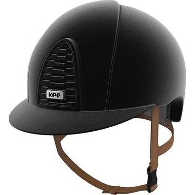 Bezpečnostní přilba italské značky KEP v černé barvě se semišovým designem, s mřížkou a rámečkem ve stejné barvě. S hnědými podbradními řemínky. Přilba je velmi lehká a dobře...
