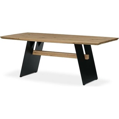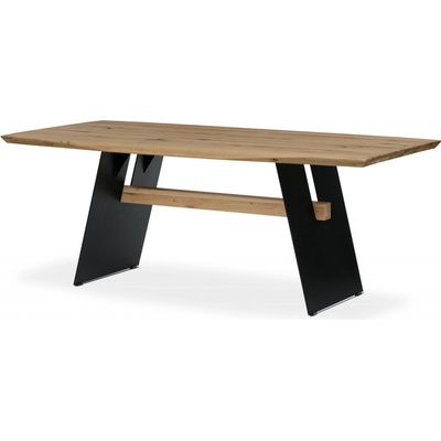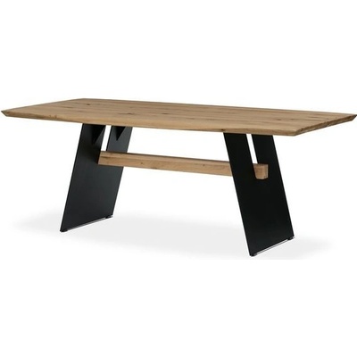 Jídelní stůl o rozměrech 200x100x75 cm kombinuje masivní dubovou desku s olejovanou povrchovou úpravou a stabilní kovovou podnoží v černé barvě. Masivní dubová deska v přírodním odstínu nabízí výraznou strukturu dřeva s viditelnými letokruhy a suky, které podtrhují...