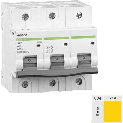 Noark 102776 Ex9B125 3P B25A Instalační jistič 25 kA, charakteristika B, 25 A, 3-pól Charakteristiky PARAMETR HODNOTA Instalační třída 3 Frekvence Vhodné pro zapuštěnou...